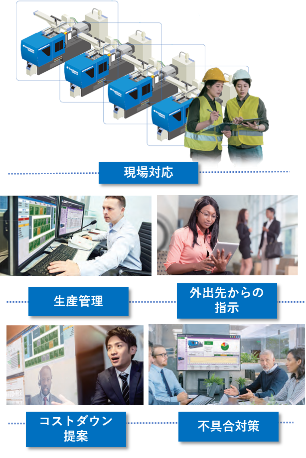 人件費の高騰や少子化により、成形現場での省人化・無人化は避けられないものになりつつあり、情報ネットワークの構築が急がれます。成形機のデータ通信により、コロナウイルスによる封鎖措置の際も、最小限の人員での工場運営をサポートできます。